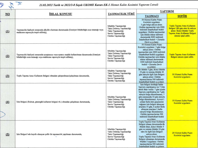 Minibüs, Taksi, Taksi Dolmuş, Servis, Otobüs ve Yük Taşımacılığı alanında faaliyet gösteren taşımacı ve şoförlerin/sürücülerin hizmet kalitesinin ölçülmesi ve böylece hizmet kaynaklı problemlerin azaltılması için 09.05.2018 Tarih ve 2018/3-6 Sayılı Hizmet Kalite Kesintisi Yaptırım Cetveli oluşturulmuştur.